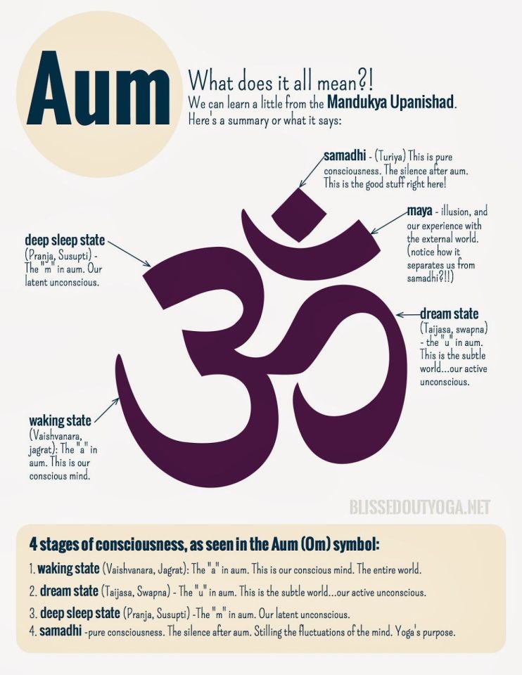 I yogisk filosofi representerer lydene skapelse(Brahma), bevaring(Vishnu) og ødeleggelse(Shiva). Vi ser også en relasjon til tilstandene: våken, drøm og dyp søvn, og til de tre guans (rajas, satsa og tamas). I Vedas er AUM lyden av solen og lyset.